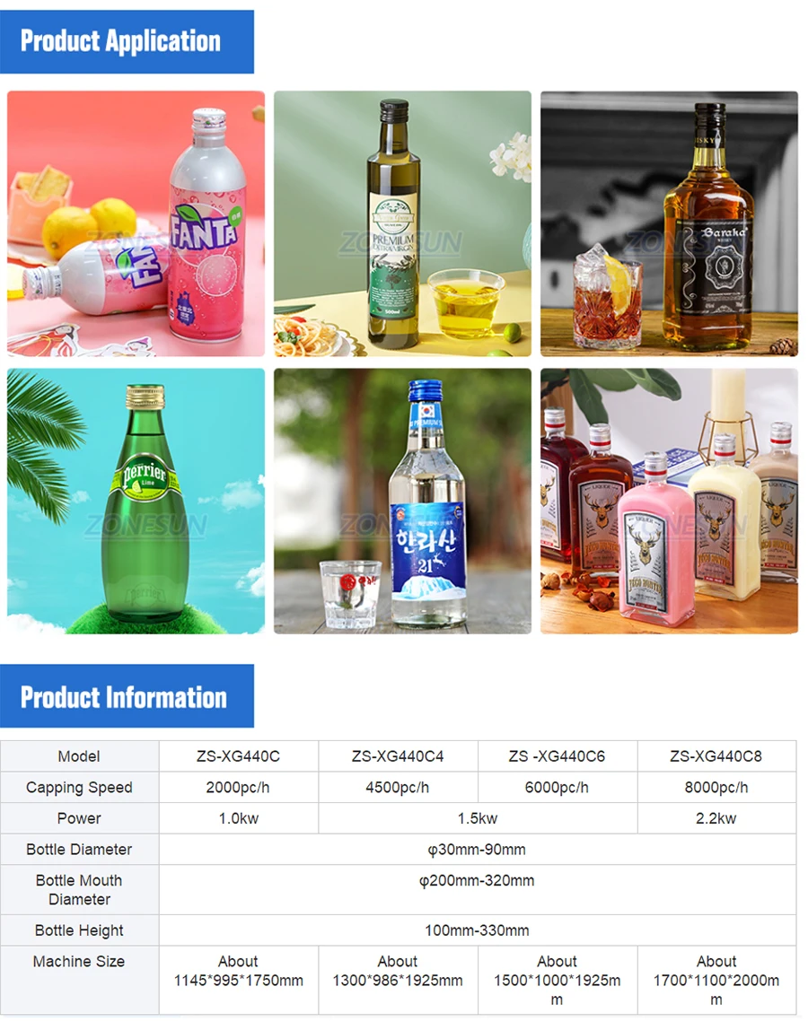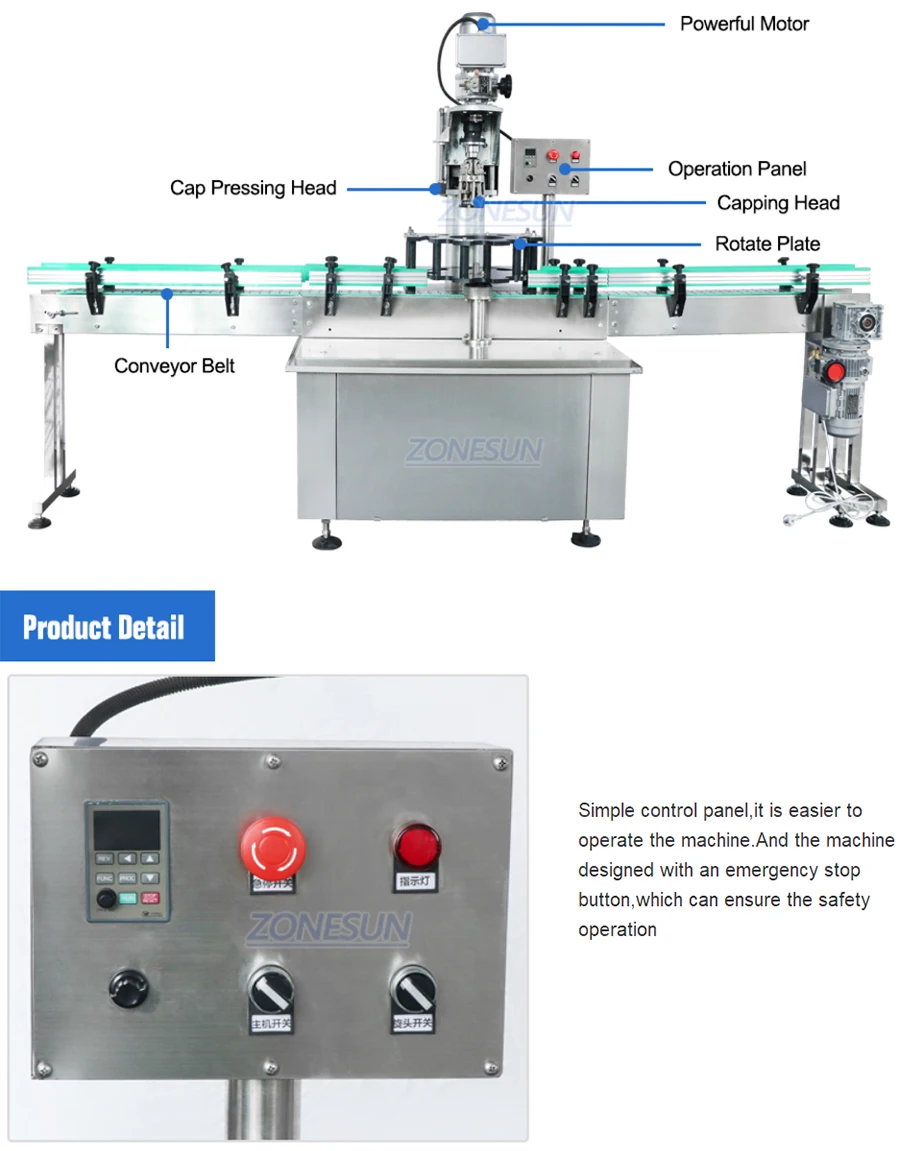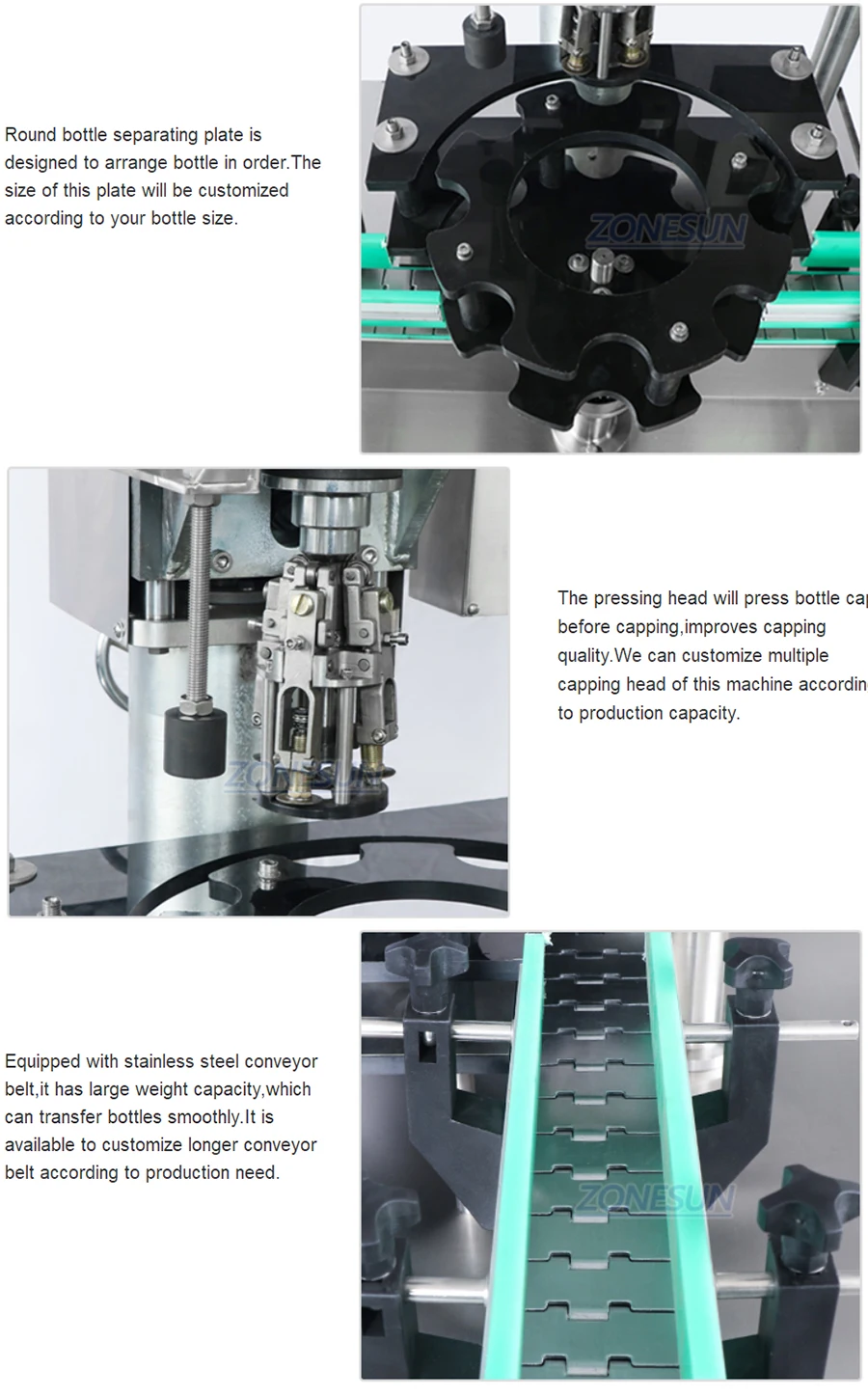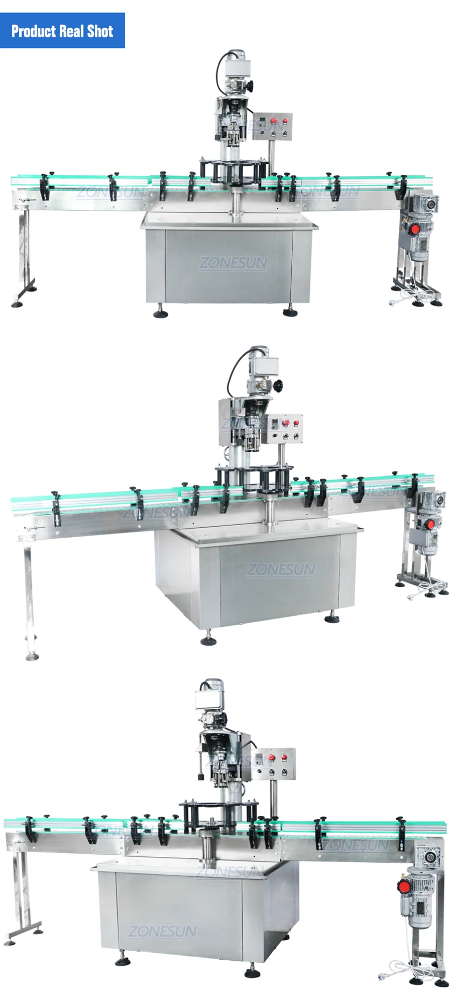Esta máquina taponadora automática es adecuada para atornillar tapas a prueba de robos, como tapas de botellas de bebidas, tapas de botellas de vino, tapas de botellas de aceite de oliva, etc. Equipada con una cinta transportadora de acero inoxidable, puede transportar contenedores de manera estable y sin problemas. Esta máquina se puede personalizar según las necesidades de los clientes. Puede ser ampliamente utilizado en las industrias de bebidas, catering y medicina.
