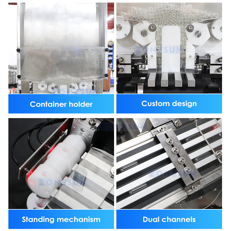 Esta es una solución personalizada para un comprador de Polonia. Es un envase monobloque de perfume. Está equipado con 2 bombas de cerámica, que es adecuada para llenar pequeños volúmenes de líquido con alta precisión de llenado. El soporte para viales funciona como un mecanismo de decodificación con canales duales que alimentan y colocan los viales en la rueda de estrella. Esto es adecuado para varios perfumes, incluidos EDT, EDP, Parfum, EDC y Eau Fraiche.