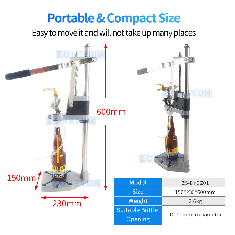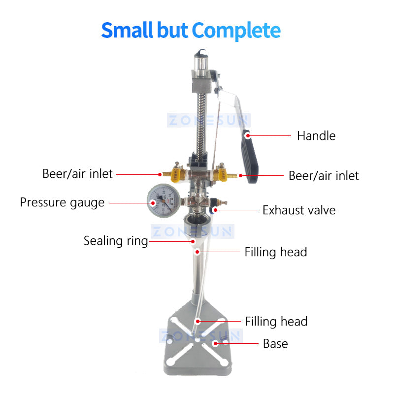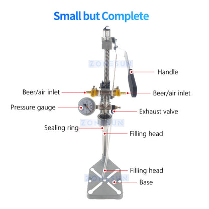 This is a beer filler. It adopts equipressure filling and it doesn't need a power supply. Yet it requires a CO2 cylinder, which is excluded. It is a type of filling machine that is designed to fill beer bottles or cans with a consistent and precise amount of beer, while maintaining a stable and consistent pressure throughout the filling process. This type of filler is commonly used in the beer industry, particularly for microbreweries and craft beer producers who need to fill smaller batches of beer quickly and efficiently.