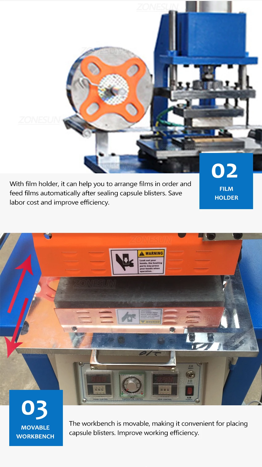 This machine is designed for sealing pill blister. It is with automatic foil paper feeding function, helping to save labor cost and improve efficiency. The mold of the machine can be customized according to your products, please feel free to contact us if you need.
