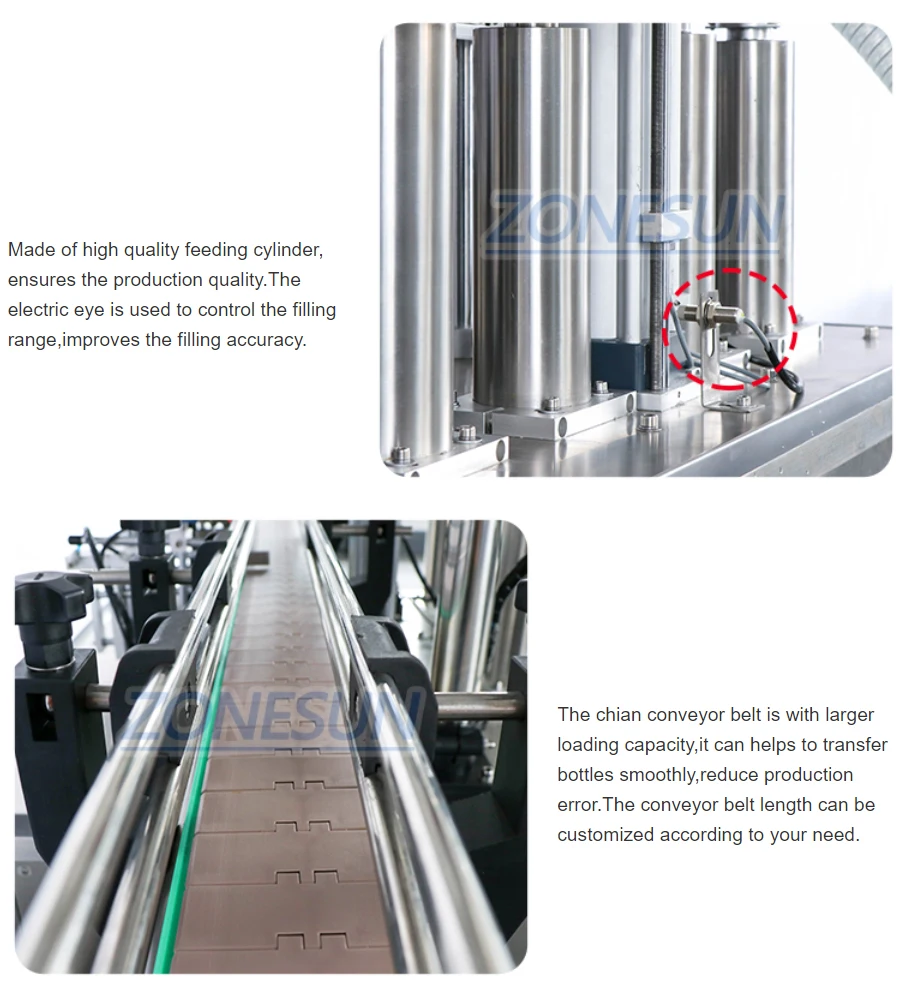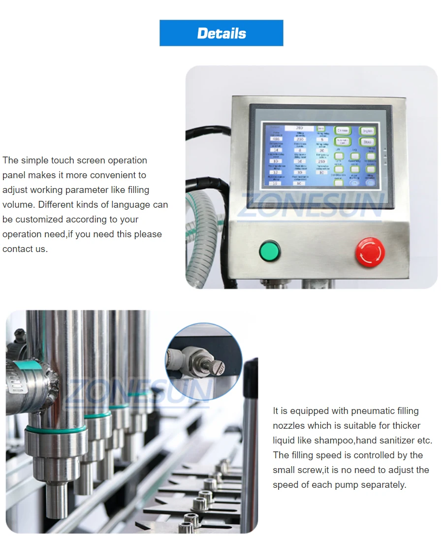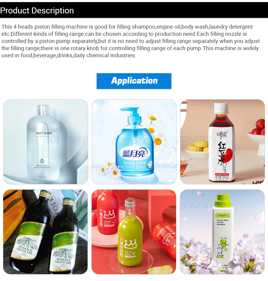 This machine is suitable for filling liquid, such as shampoo, laundry detergent, cooking oil, etc. It can work with automatic labeling machine and capping machine, realizing automated production.
