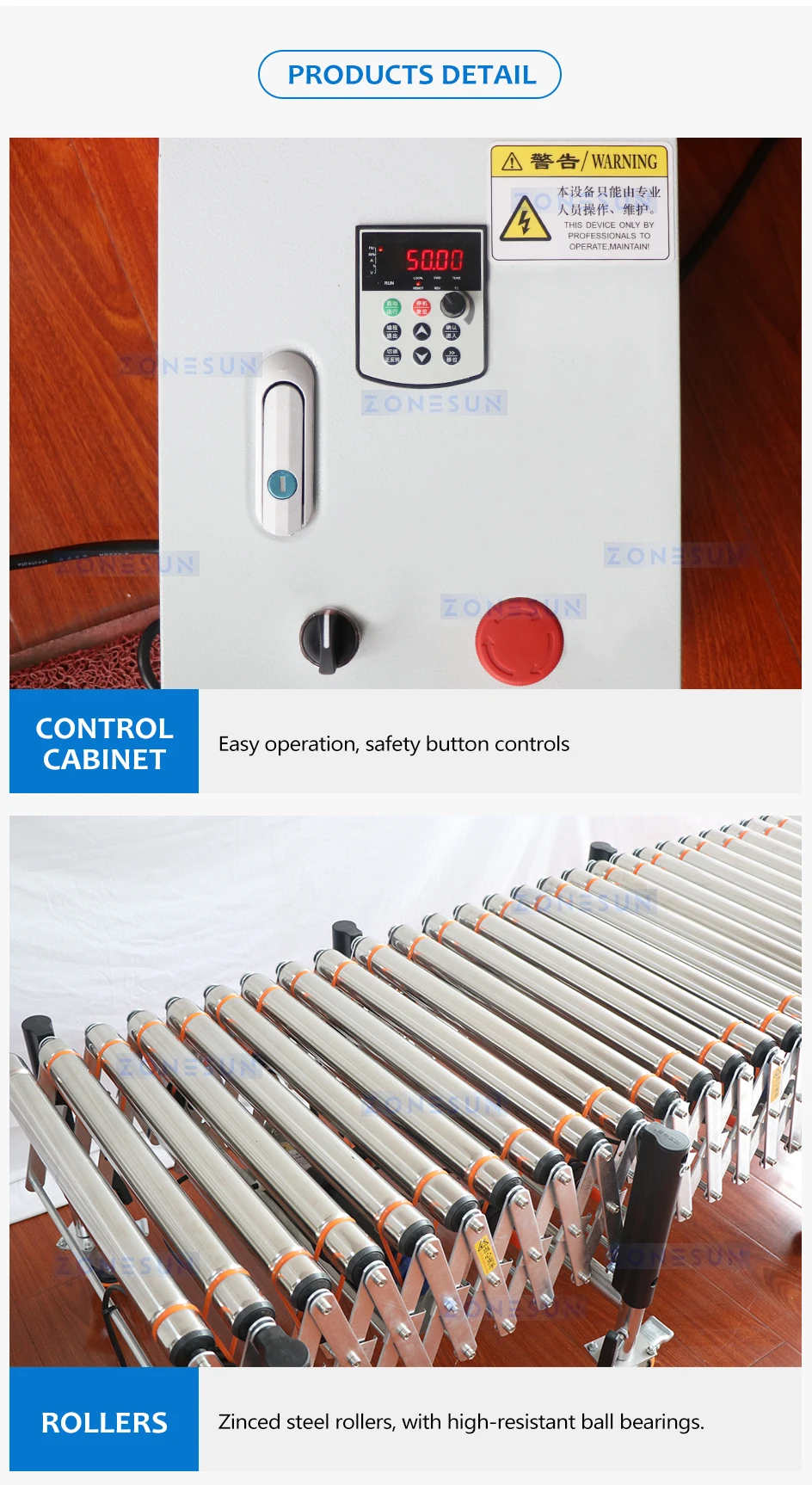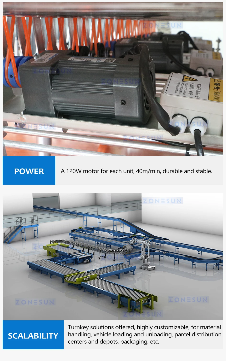 This roller conveyor is a type of material handling equipment that is designed to transport goods or materials using a series of rollers. The rollers are powered by electric motors. Roller conveyors can be used in a variety of industrial and commercial settings, including manufacturing, distribution, and transportation. They are often used to transport heavy or bulky items, such as pallets, crates, or large containers. Whatever your packaging needs are, you can rely on ZONSUN.