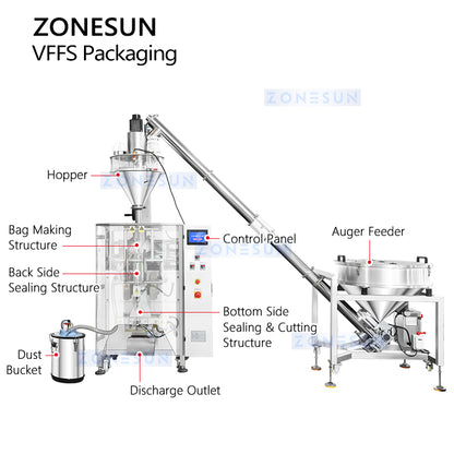 ZONESUN ZS-FS06 Automatic Screw Powder Filling Machine Laundry Detergent Disinfectant Powder VFFS Packaging Machine with Dust Bucket