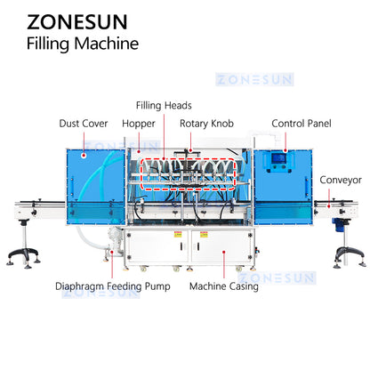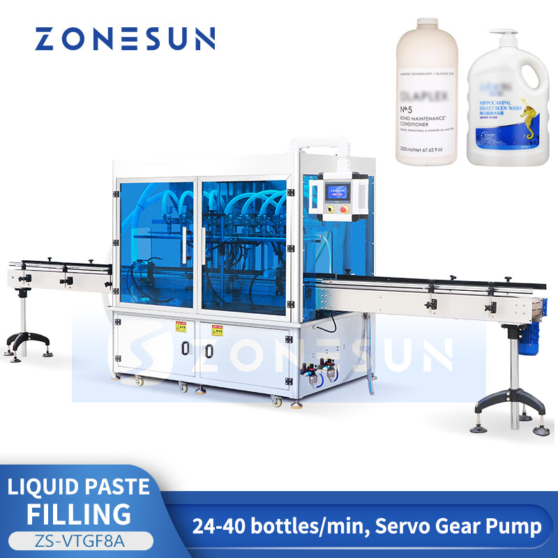 The ZS-VTGF8A is a high-performance 8-head liquid and paste filling machine equipped with servo-driven gear pumps. Designed for medium to large volume applications, it supports a wide filling range from 50ml to 5000ml, making it ideal for products like shampoo, conditioner, lotion, and detergent. With a robust stainless-steel build, intelligent touch screen control, and working speed of up to 40 bottles/min, this machine ensures fast, accurate, and stable filling with minimal downtime. Customizable bottle sizes and high filling precision of ±0.5% make it perfect for both industrial and commercial filling operations.