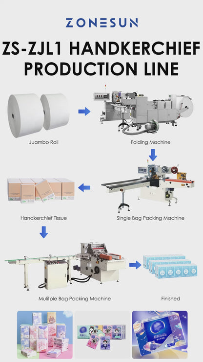 Introducing our fully automatic tissue production line, featuring a folding machine, single-pack sealing machine, and multi-pack machine. This advanced system utilizes an intelligent feeding mechanism to significantly enhance production efficiency. By reducing labor requirements, this automated line greatly lowers production and management costs. It employs vacuum suction and high-speed folding for optimal paper handling. With non-stepping speed adjustment, the machine operates smoothly, making it the ideal equipment for producing four-fold tissues.