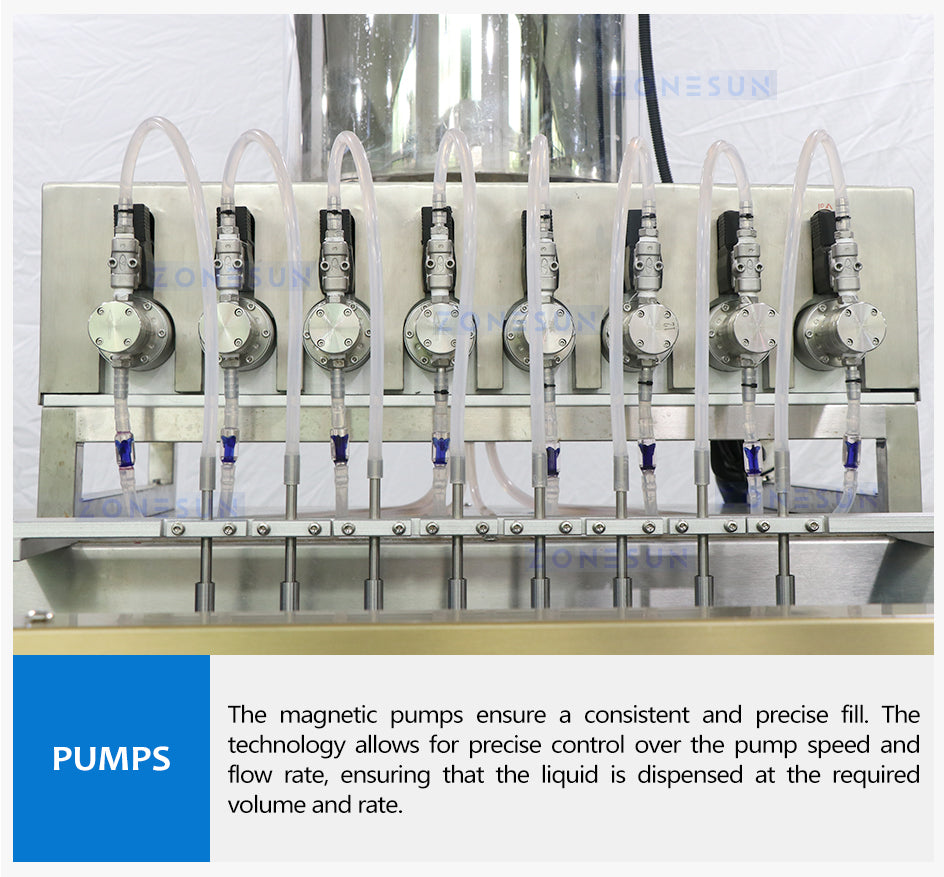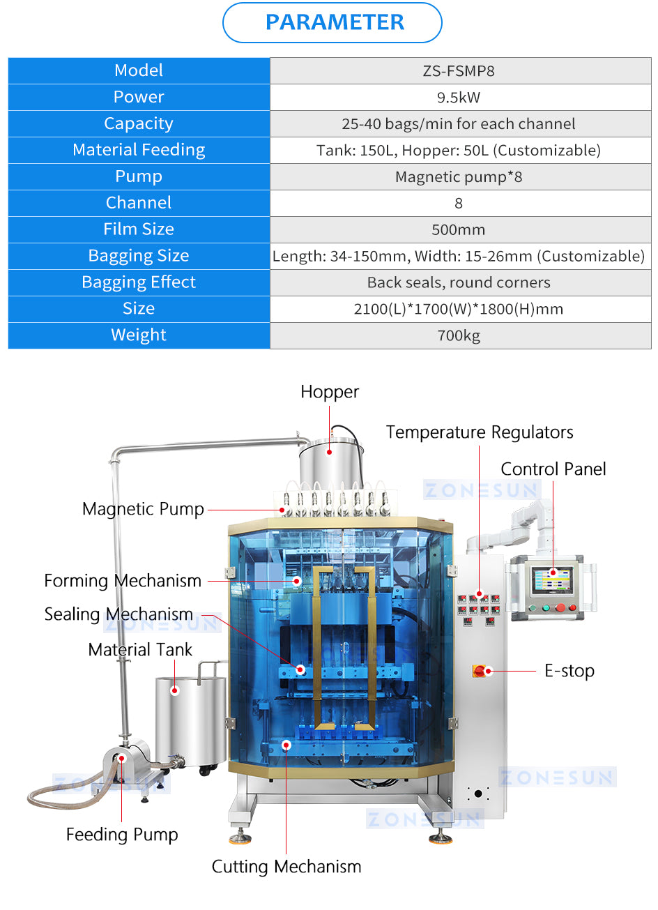 To use the VFFS liquid bagger, simply pour your liquid into the material tank. When the machine starts, the feeding pump will transport the liquid up to the hopper of the main machine. The machine then uses magnetic pumps to fill the liquid in 8 channels, with unparalleled accuracy and precision.
