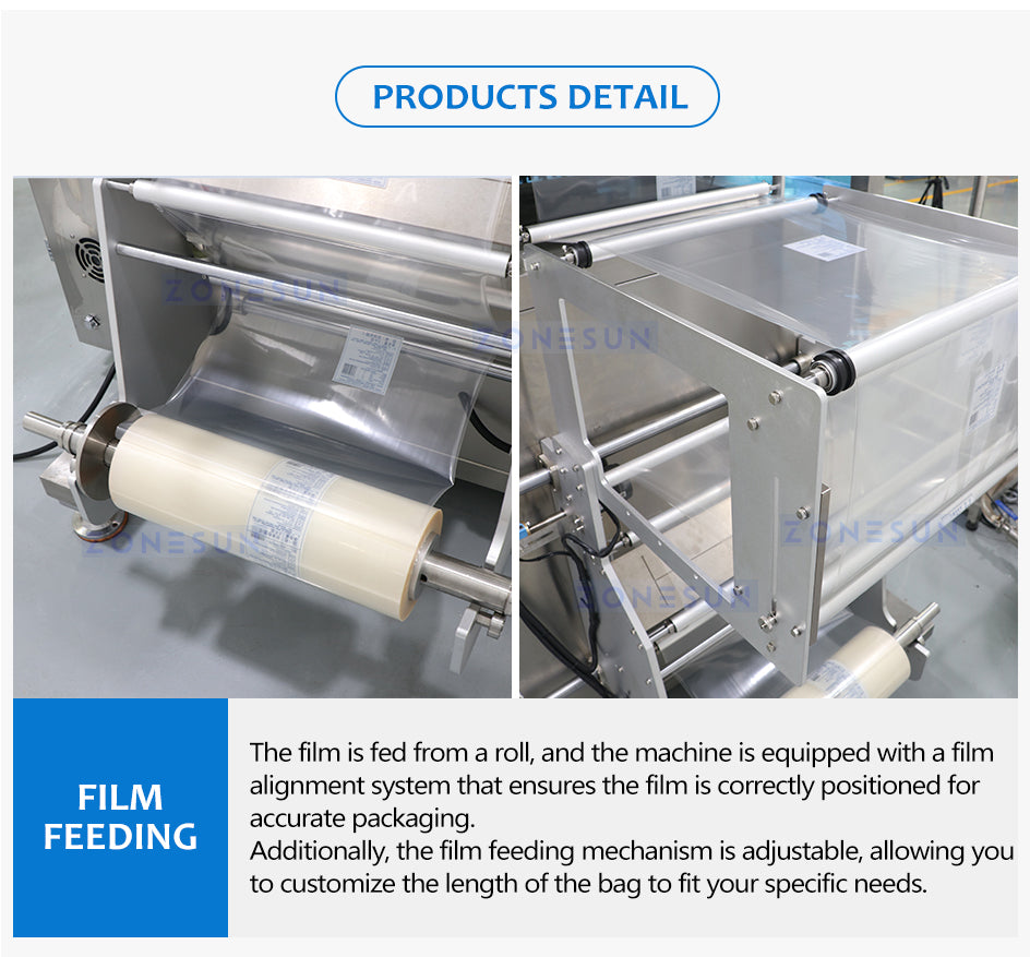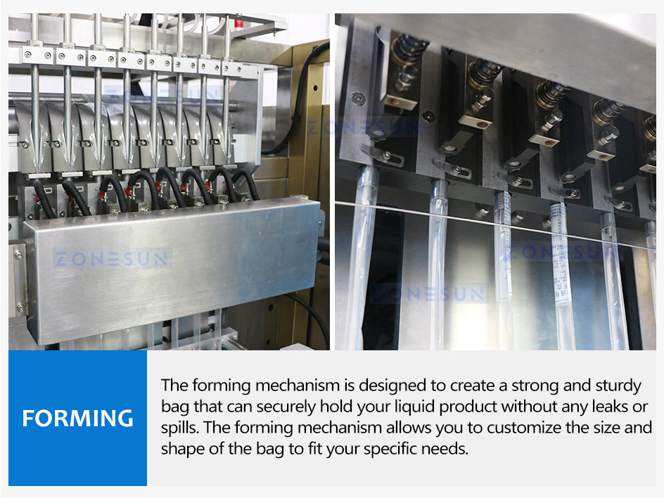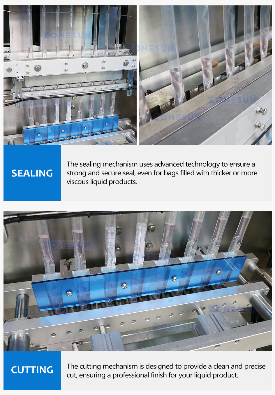 Meanwhile, the film is automatically fed and formed in the forming station, ensuring a perfect fit for your liquid product. The machine then moves to the sealing station, where the bag is securely sealed to ensure no leaks or spills. Finally, the cutting station cuts the bag to the desired length, providing a clean and professional finish.