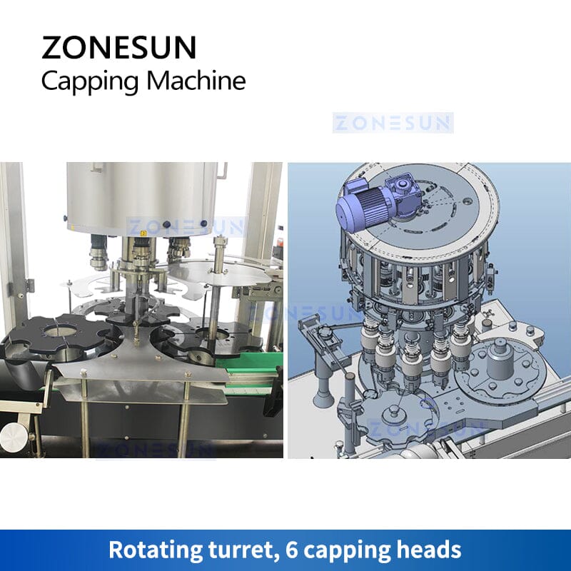 The Rotary Screw-on Capping Machine has a capacity to cap up to 6000 bottles per hour. The auger separator is responsible for separating the bottles and feeding them onto the infeed star wheel. The infeed star wheel moves the bottles in a single file towards the rotary turret. The rotary turret is the core of the machine, holding the bottles in place while the capping heads rotate to screw the caps onto the bottles. Once capped, the bottles move on to the outfeed star wheel, which moves them out of the machine for further processing. Above the outfeed star wheel, there is a star wheel for feeding caps transported from an outside cap unscrambler. Whatever your packaging needs are, you can rely on ZONSUN.